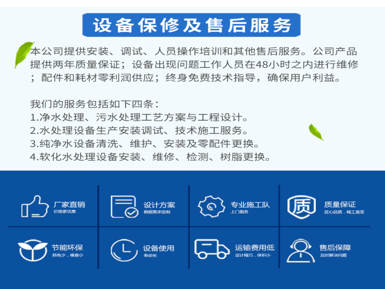 公司自成立以來,始終致力于推動環保事業的發展,不斷拓展凈水及污水處理技術,持續改良生產工藝細節,已形成從水處理產品的研發設計到設備的制造集成,從農村生活安全飲水工程,生產用水工程,工業超純水工程、生活污水處理工程,工業廢水深度處理及回收利用到以及BOT項目運作等完整的水處理產業鏈,可為用戶提供不同配置的水處理設備集成全套解決方案,提供水處理全方位一站式服務。