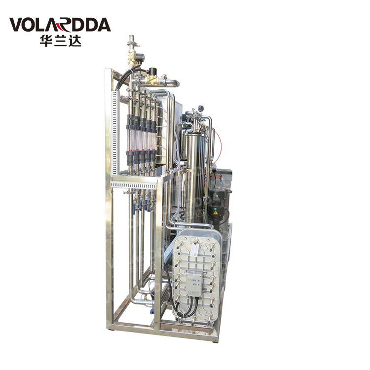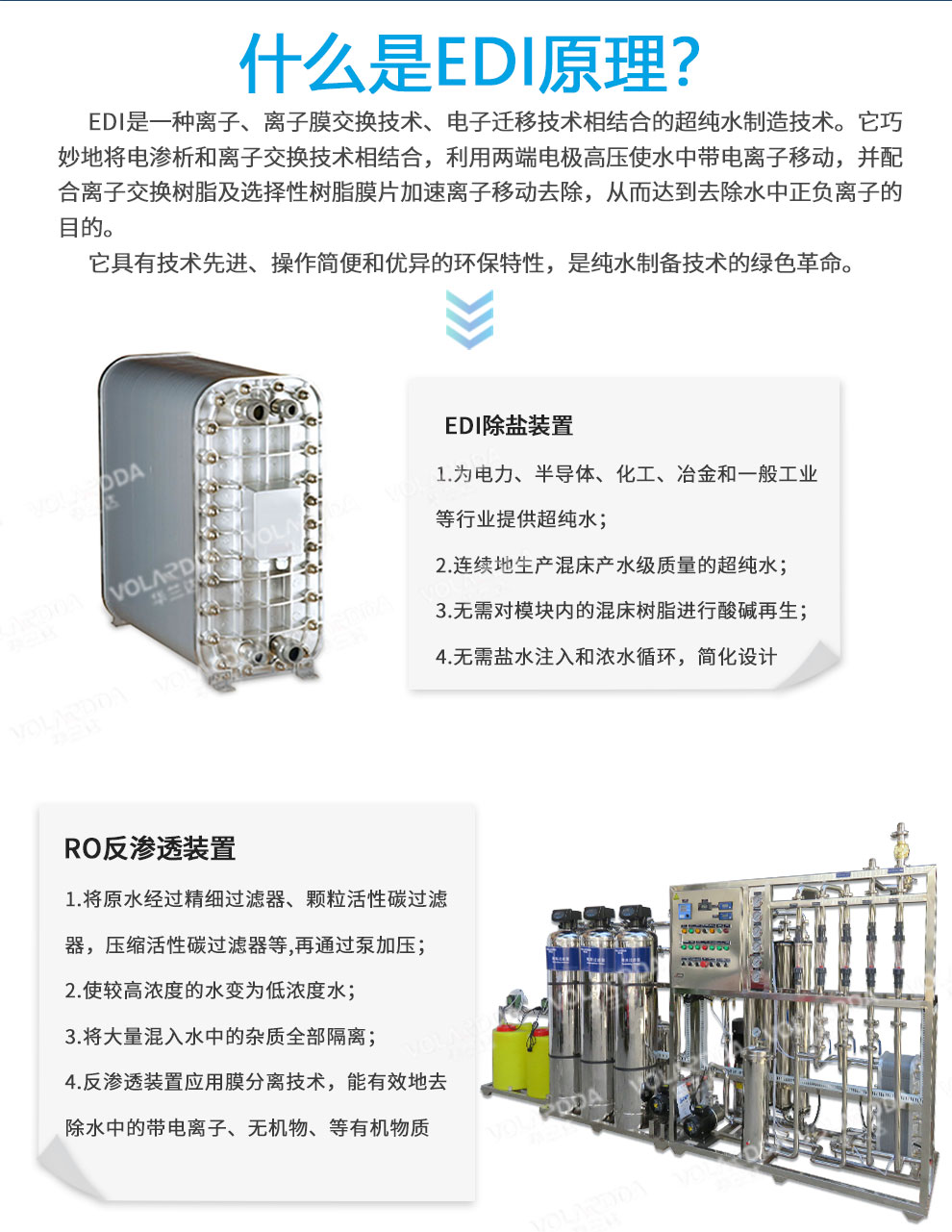 DI是一種將離子交換技術、離子交換膜技術和離子電遷移技術(電滲析技術)相結合的高純水制造技術。該技術利用離子交換能深度脫鹽來克服電滲析極化而脫鹽不干凈,又利用電滲析極化而發生水電離產生H和OH離子實現樹脂自再生來克服樹脂失效后通過化學藥劑再生的缺陷,是20世紀80年代以來逐漸興起的新技術。經過十幾年的發展,EDI技術已經在北美及歐洲占據了相當部分的超純水市場。EDI裝置屬于精處理水系統,一般多與反滲透(RO)配合使用,,組成預處理、反滲透、EDI裝置的超純水處理系統,,取代了傳統水處理工藝的混合離子交換設備。EDI裝置進水要求為電阻率為0.025-0.5MΩ·cm,反滲透設備可以滿足要求。EDI純水設備可生產電阻率高達18MΩ·cm以上的超純水。