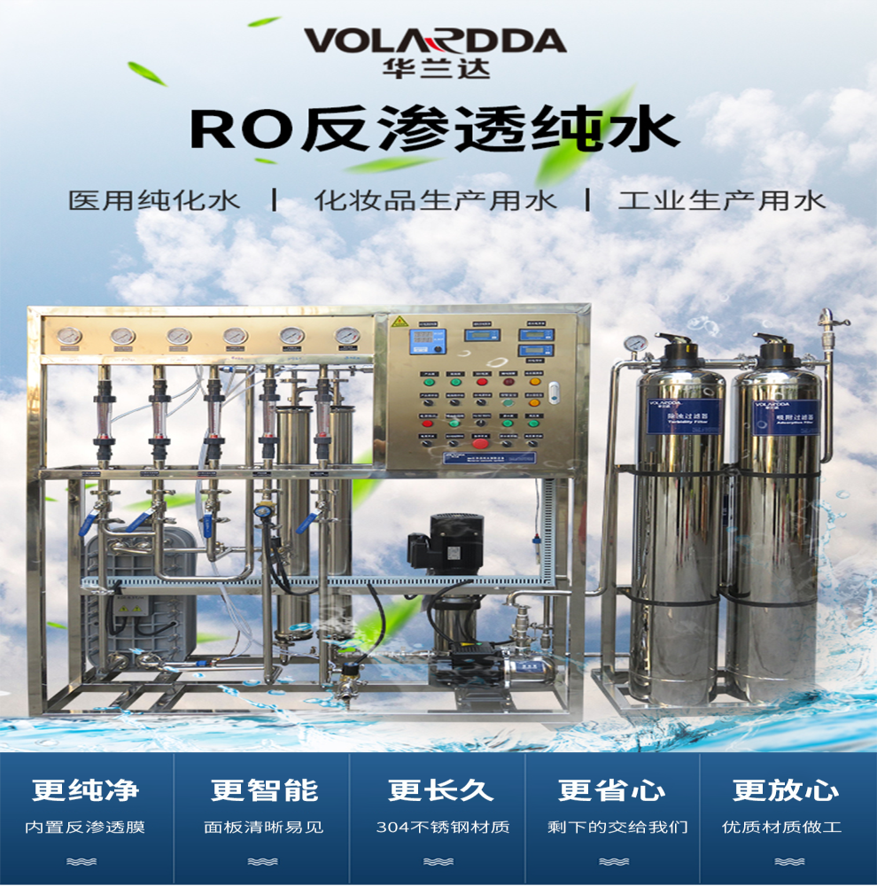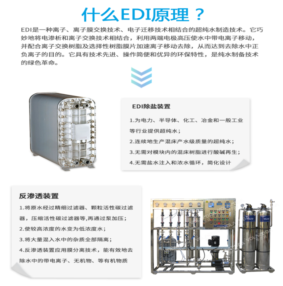 EDI是一種將離子交換技術、離子交換膜技術和離子電遷移技術(電滲析技術)相結合的高純水制造技術。該技術利用離子交換能深度脫鹽來克服電滲析極化而脫鹽不干凈,又利用電滲析極化而發生水電離產生H和OH離子實現樹脂自再生來克服樹脂失效后通過化學藥劑再生的缺陷,是20世紀80年代以來逐漸興起的新技術。經過十幾年的發展,EDI技術已經在北美及歐洲占據了相當部分的超純水市場。EDI裝置屬于精處理水系統,一般多與反滲透(RO)配合使用,,組成預處理、反滲透、EDI裝置的超純水處理系統,,取代了傳統水處理工藝的混合離子交換設備。EDI裝置進水要求為電阻率為0.025-0.5MΩ·cm,反滲透設備可以滿足要求。EDI純水設備可生產電阻率高達18MΩ·cm以上的超純水。