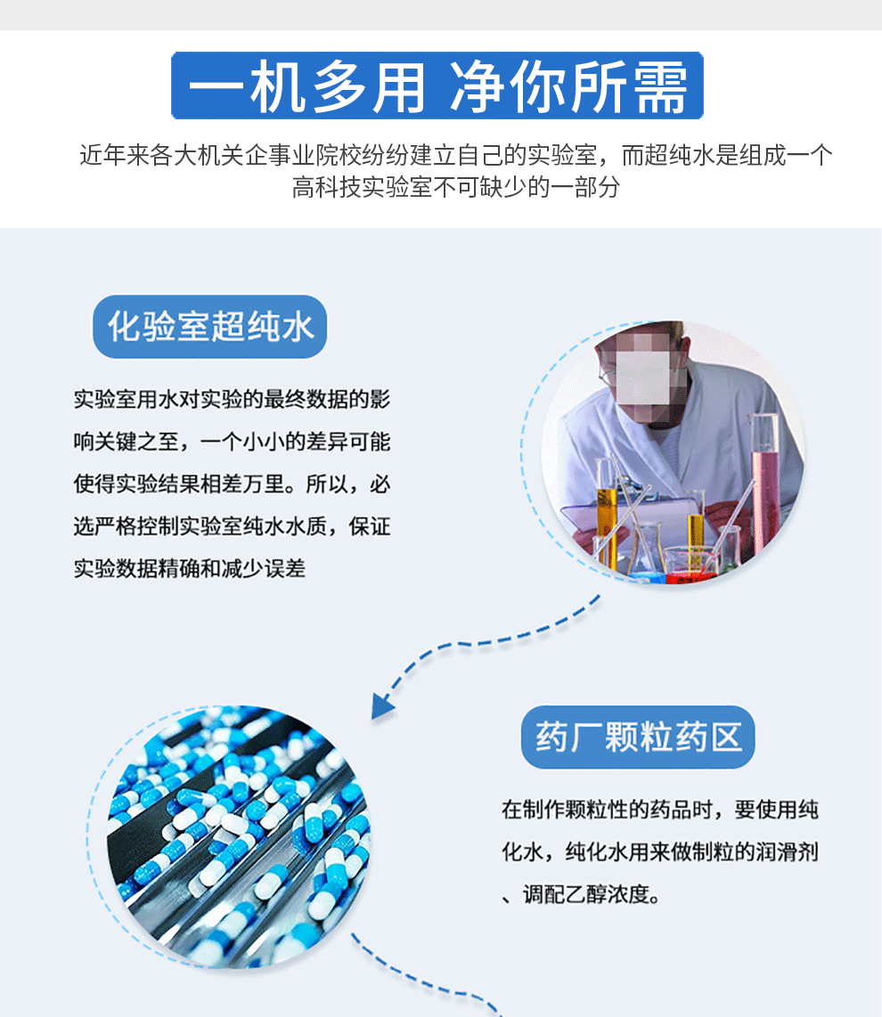 2、化工工藝用水、化學(xué)藥劑、化妝品等用純水。
