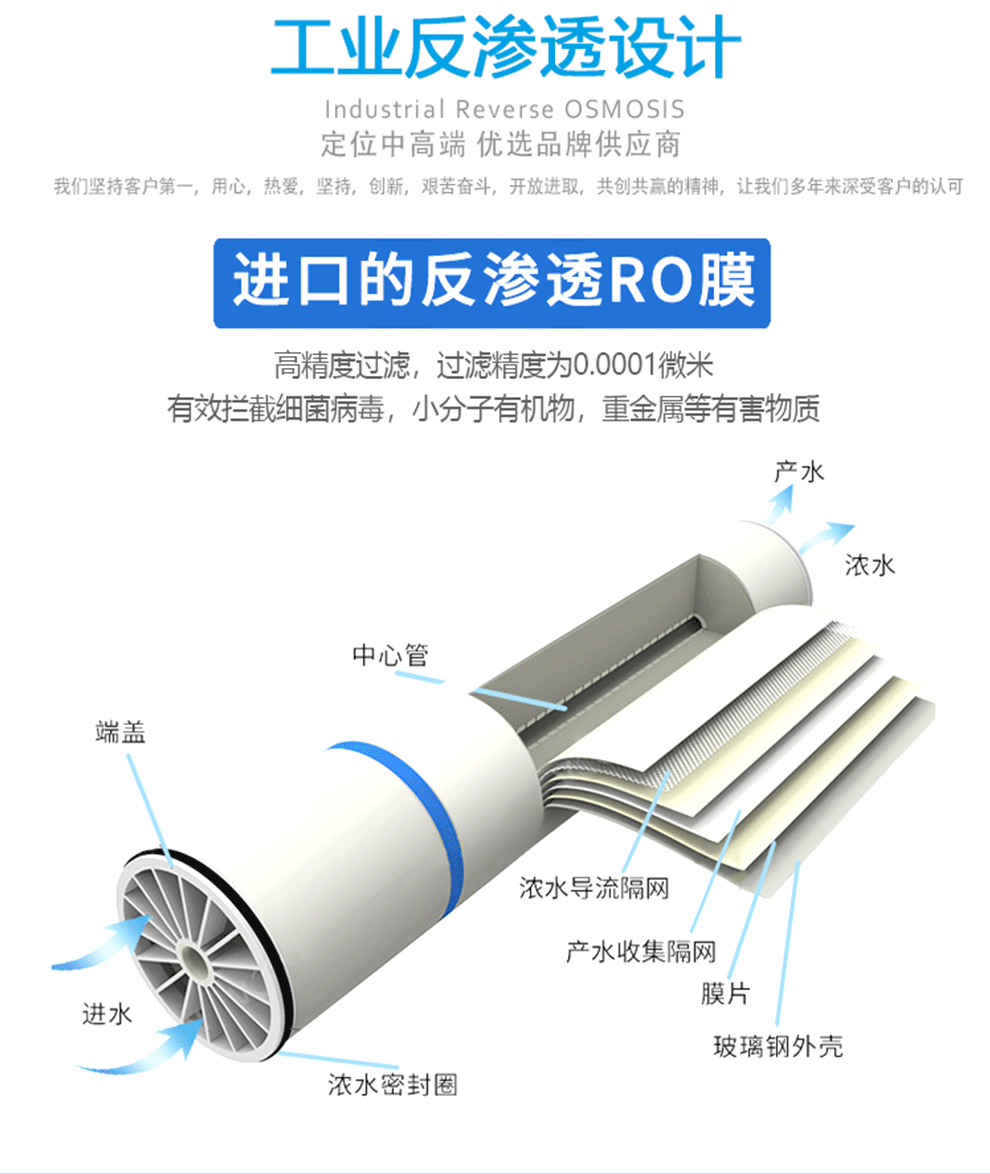 RO反滲透設備是利用足夠的壓力使溶液中的溶劑(一般常指水)通過反滲透膜(一種半透膜)而分離出來,方向與滲透方向相反,可使用大于滲透壓的反滲透法進行分離、提純和濃縮溶液。利用反滲透技術可以有效的去除水中的溶解鹽、膠體,細菌、病毒、細菌內毒素和大部分有機物等雜質。反滲透膜的主要分離對象是溶液中的離子范圍,無需化學品即可有效脫除水中鹽份,系統除鹽率一般為98%以上。所以反滲透是先進的、也是節能、環保的一種脫鹽方式,也成為了主流的預脫鹽工藝。