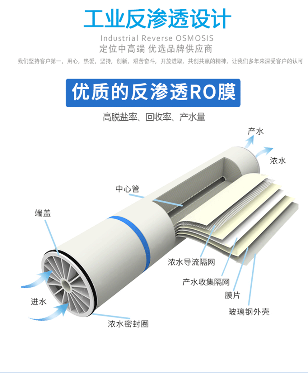 RO反滲透設備是利用足夠的壓力使溶液中的溶劑(一般常指水)通過反滲透膜(一種半透膜)而分離出來,方向與滲透方向相反,可使用大于滲透壓的反滲透法進行分離、提純和濃縮溶液。利用反滲透技術可以有效的去除水中的溶解鹽、膠體,細菌、病毒、細菌內毒素和大部分有機物等雜質。反滲透膜的主要分離對象是溶液中的離子范圍,無需化學品即可有效脫除水中鹽份,系統除鹽率一般為98%以上。所以反滲透是先進的、也是最節能、環保的一種脫鹽方式,也成為了主流的預脫鹽工藝。