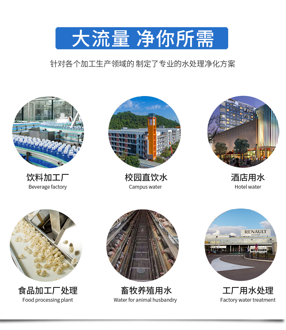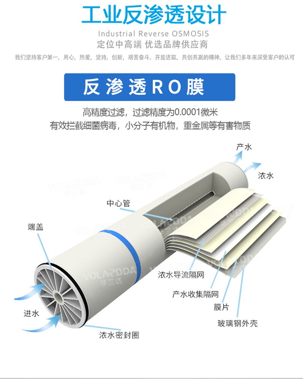 由于反滲透膜分離技術的先進、高效和節能特性,各部門領域均得到廣泛的應用,已有大型的反滲透水處理設備用于海水淡化,苦咸水凈化及工業廢水處理。利用反滲透脫鹽,可制備純水或超純水用于半導體、集成電路制造用水、發電廠鍋爐用水、醫藥行業用水、化工行業用水、飲料行業用水及其他行業(化妝品、印染、電鍍等)用水。利用其脫水濃縮特性,還可用來濃縮果蔬汁、牛奶、中藥等。