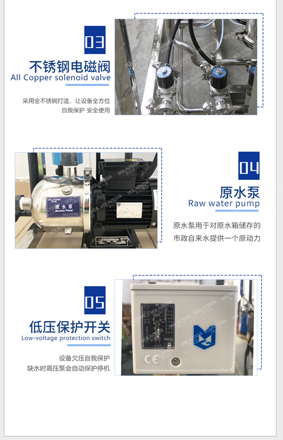 8、產品出水電導率:<10μs/cm(原水<500μs/cm) 出水水質達到:《國家生活飲用水標準》、《世界衛生組織直飲水標準》、《生活飲用水水質處理器衛生安全與功能評價規范-反滲透處理裝置》、《瓶裝飲用純凈水衛生標準(GB17324-1998)》要求。