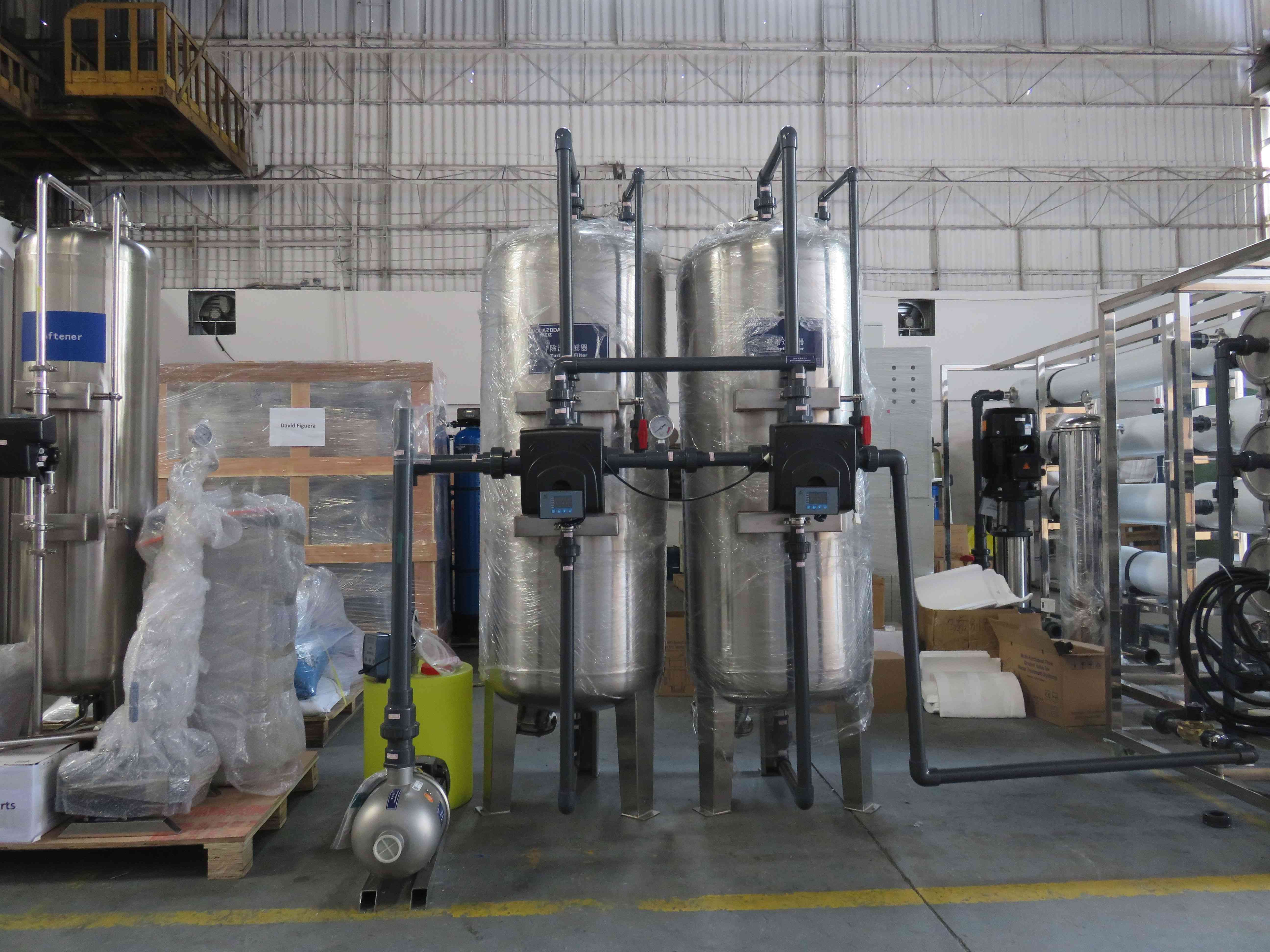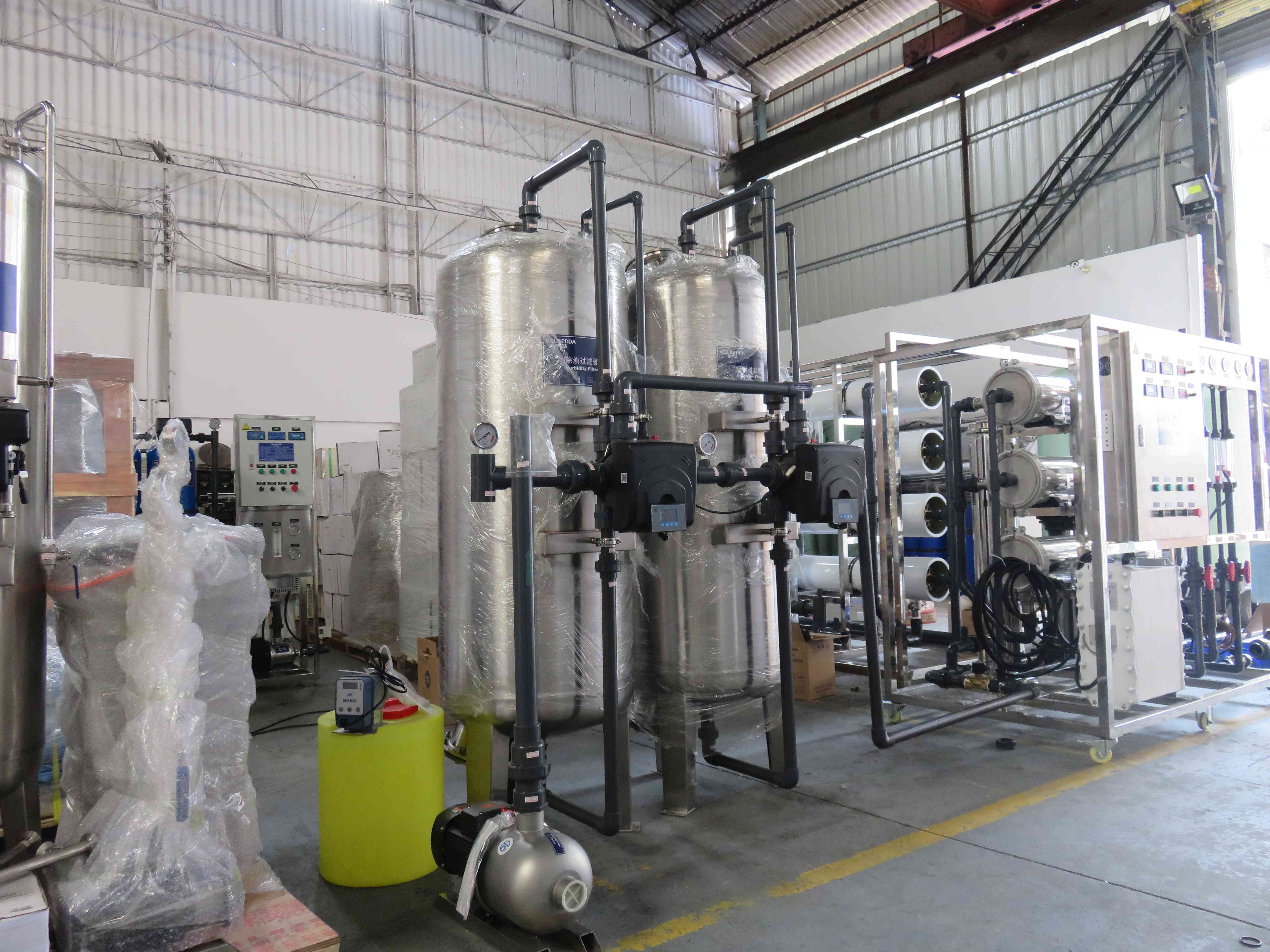 原水→原水箱→增壓泵→砂過濾器→活性炭過濾器→阻垢劑裝置→5μ精密過濾器→一級高壓泵→一級膜處理系統→一級RO水箱→二級高壓泵→二級膜處理系統→二級RO水箱。